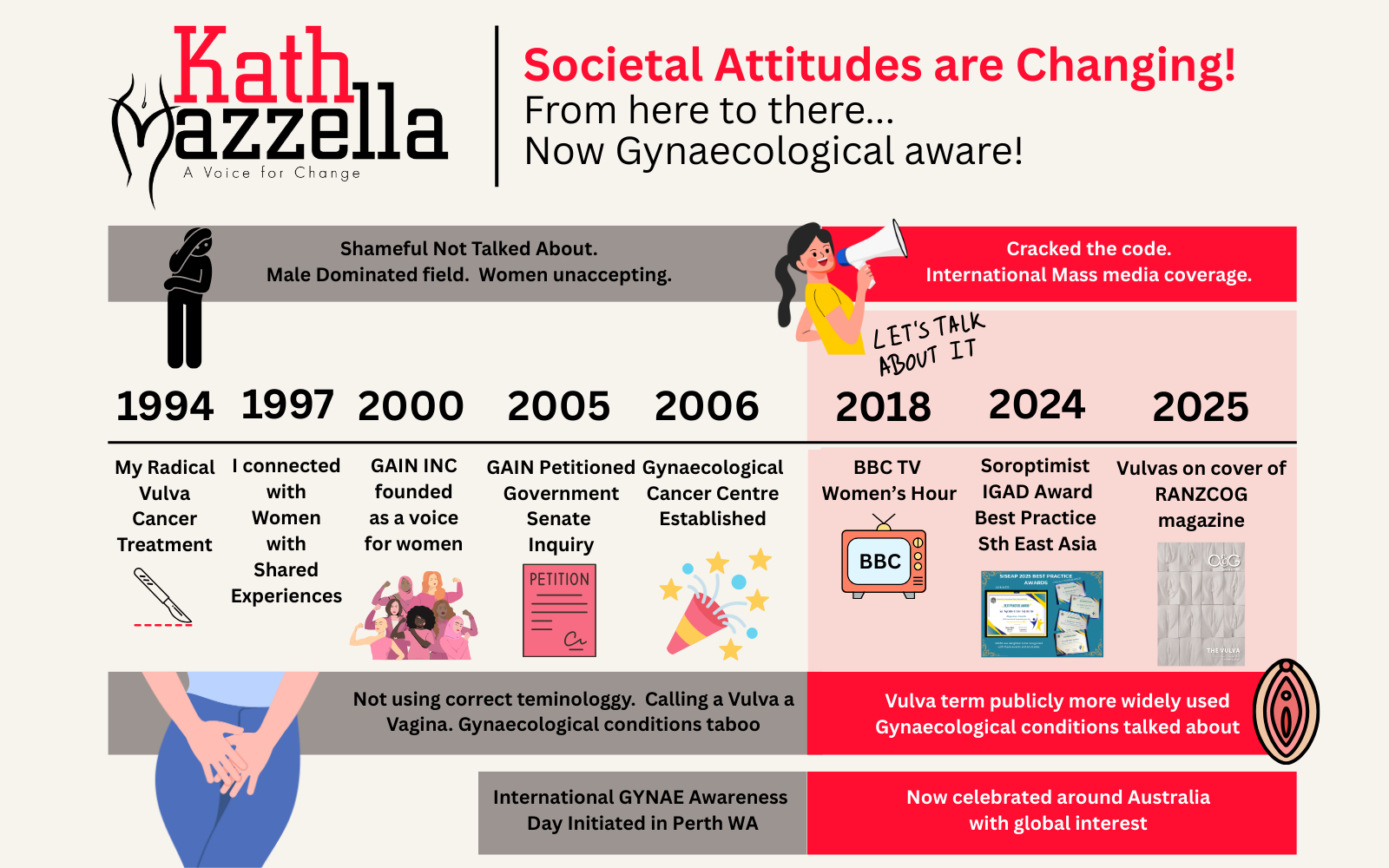 Speaking up and speaking out about women's Gynaecological and Sexual Health Awareness and associated Mental Health conditions and pressing society for greater acceptance and more support for women.